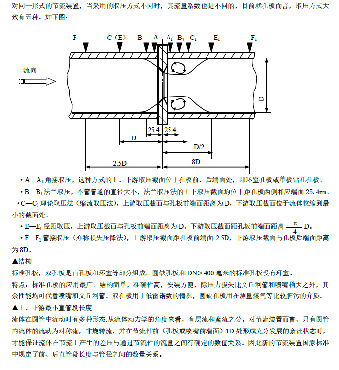 1、角接取壓標(biāo)準(zhǔn)孔板,適用于管徑50mm至1000mm以上。雷諾數(shù)Red的范圍為5×103—107。直徑比為β(為0.22至0.80)。
